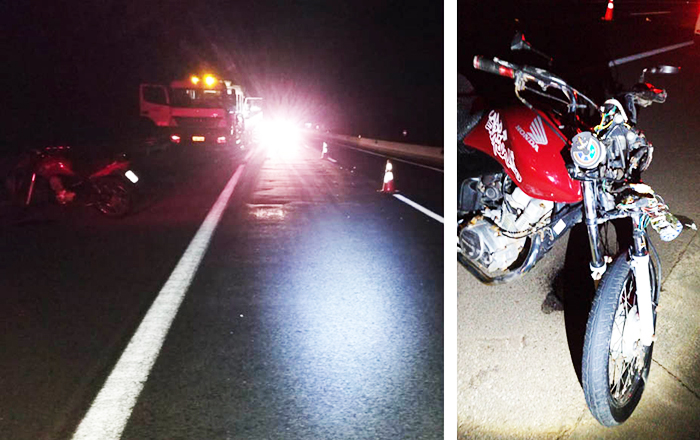 Vítima saia debaixo de caminhão com problema quando foi atingido por moto que 'furou' sinalização